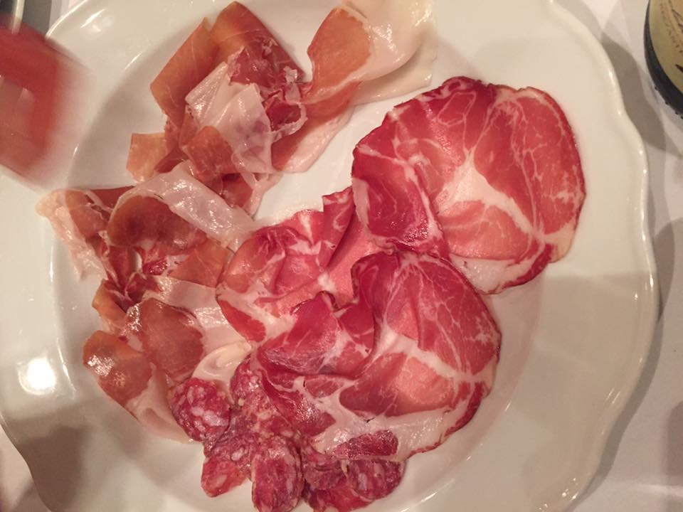 Antipasto con salumi vari, crescente alle patate e focaccia.